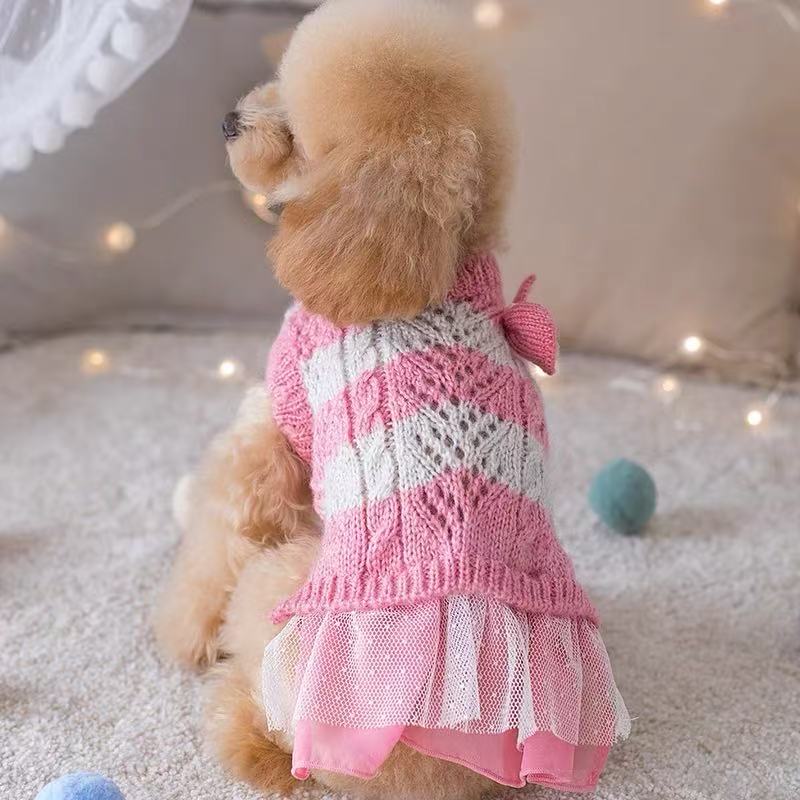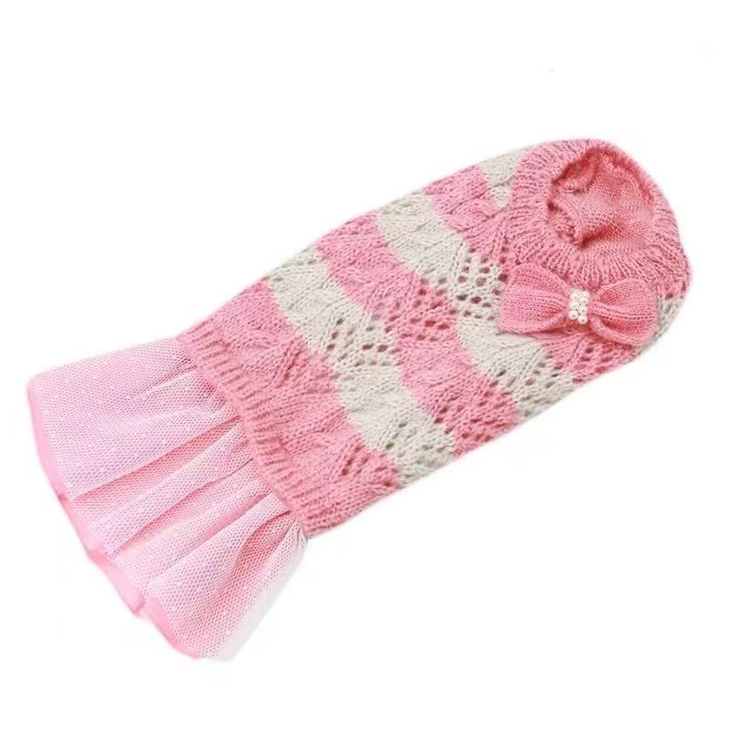 秋冬 クリアランス ペット用リボン付きツートンレースニットセーター